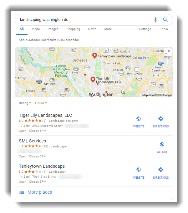 Most homeowners and property managers want a landscaper that’s local to the area. When consumers make geographically related searches like “landscaper near me” or “landscaping company in [city, state],” Google and other search engines show what’s called the local pack (otherwise known as map listings):